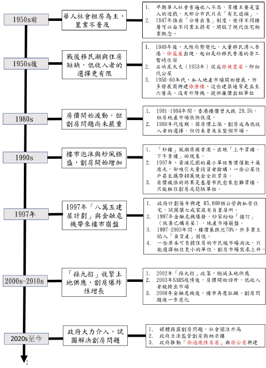 在了解香港納米樓的成型過程前,首先需要回顧背後的歷史與社會背景。隨著都市化的發展、人口激增,以及土地供應的緊張,香港的房地產市場經歷了多次波動。尤其在1950年代到1990年代的幾個重要階段中,住房問題逐漸加劇,特別是低收入群體面臨的居住困境。 如同下圖整理的期間所示,從早期的華人社會普遍以租屋為主,到戰後移民潮帶來的巨大住房需求,香港的房地產發展歷程充滿了挑戰與變遷。隨著房價飆升,越來越多的市民無力負擔大型住宅,開始選擇面積較小的房屋。這些因素的交織,最終促成了極小型住宅(如納米樓)的誕生。 要了解香港納米樓的發展,必須先理解其背後的社會與經濟因素。只有在掌握了這些背景後,我們才能更清楚地看見,這些因素如何為極小型住宅的成型奠定了基礎。 說明: ※籠屋:一種極端狹小、環境惡劣的租住房屋,通常是由房東將一個單位內部進一步細分,用鐵絲網或木板隔開成數個小空間,供單身人士或低收入者居住。 ※徙置區:政府開始興建徙置大廈(初代公屋),提供最基本的居住需求,但這些房屋簡陋且供應有限。 ※唐樓與板間房:部分私人業主將大單位分割成小房間出租,初代「劏房」模式逐漸成形。 ※過度性房屋:過渡性房屋是指提供給需要臨時安置的低收入家庭或特殊群體(例如等候公屋的居民、因災害或其他原因需要臨時安置的人)的住宅。其主要目的是為了解決這些家庭在長期解決住房問題前的臨時居住需求。 ※公屋:公屋是由香港政府提供的長期居住設施,專門為低收入家庭或有特殊需求的人群提供較為穩定的居住環境。公屋的建設目的是解決無力在市場上購房或租房的市民的住房需求。