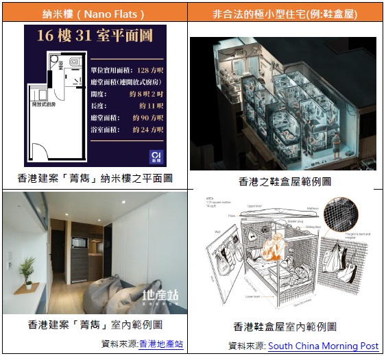 「在香港,極小型住宅可分為合法的『納米樓』以及非法或不符合標準的『劏房』、『籠屋』或者中國的『中國城中村群租房』。 納米樓(Nano Flats)指的是使用面積小於200平方呎(約18.5平方公尺)的住宅,這種住房形式最早於2010年代興起,主要因應市場對負擔得起的房屋需求。 而這些不合法的建物通常使用面積未經規範,僅有的極端狹小空間,居住環境惡劣,甚至影響居住者健康與安全。