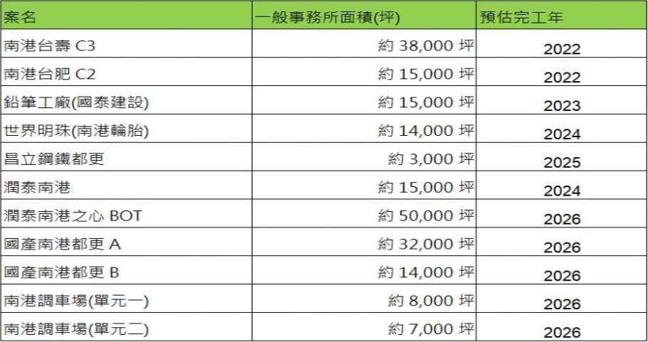 南港區預計陸續於2026年前供給約21萬坪之一般事務所面積,其中部分為商業辦公大樓、部分為廠辦大樓,現況僅世界明珠預售中,其餘多為只租不售。各開發案位置圖如下圖: