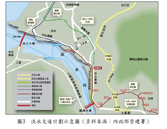 淡水地區因地形限制,聯外交通容納有限。交通問題數十年來一直是阻礙淡水,甚至三芝、北海岸發展的關鍵。尤其台二線(關渡至紅樹林段)塞車問題,相信是往來淡水民眾共同的夢魘。近期政府指示開發淡海新市鎮以提供大量合宜住宅議題,相關改善交通建設規劃也重新浮上檯面。以下圖3表示目前已動工或規劃中之淡水交通線:
